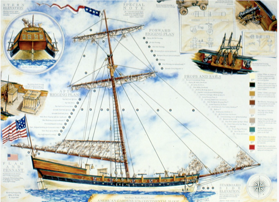 The ship was designed by Dering Consultants and debuted at the park in 1993. According to the companyโs website, โDering designed and developed Disneyโs Golden Dream 18th Century Revolutionary Warship from concept to completionโ for display at the park. Itโs a โhistorically accurate replica of a 1776 Continental rum runner sloop. A sloop is a sailing ship with a single mast and a fore-and-aft rig. Sloops have been both war and trading ships with a flat deck to hold a vast array of supplies.โ