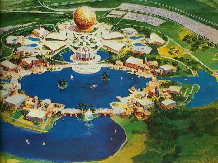 Eventually, it was decided that there would be an American pavilion, but original plans called for it to be a modernist steel and glass building housing an animatronic show which would be situated at the FRONT of the World Showcase, acting as โhostโ that would beckon guests from Future World. As development of the park progressed, those plans were altered to the colonial-themed pavilion at the back of the World Showcase that opened with the park in 1982.