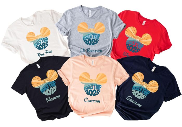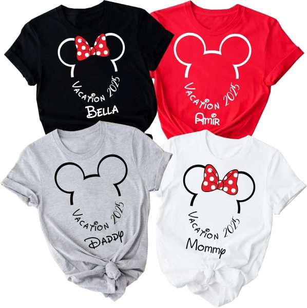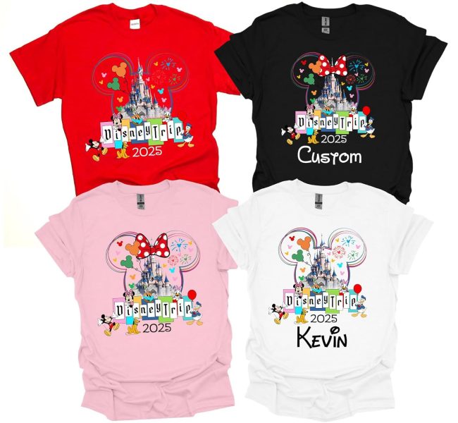 Next, these Vacation 2025 Shirts rock a more minimalist design. You can choose between an outline Mickey or Minnie, add your name and year, and choose your favorite color. They definitely look to be comfy and perfect for a long day of park hopping.