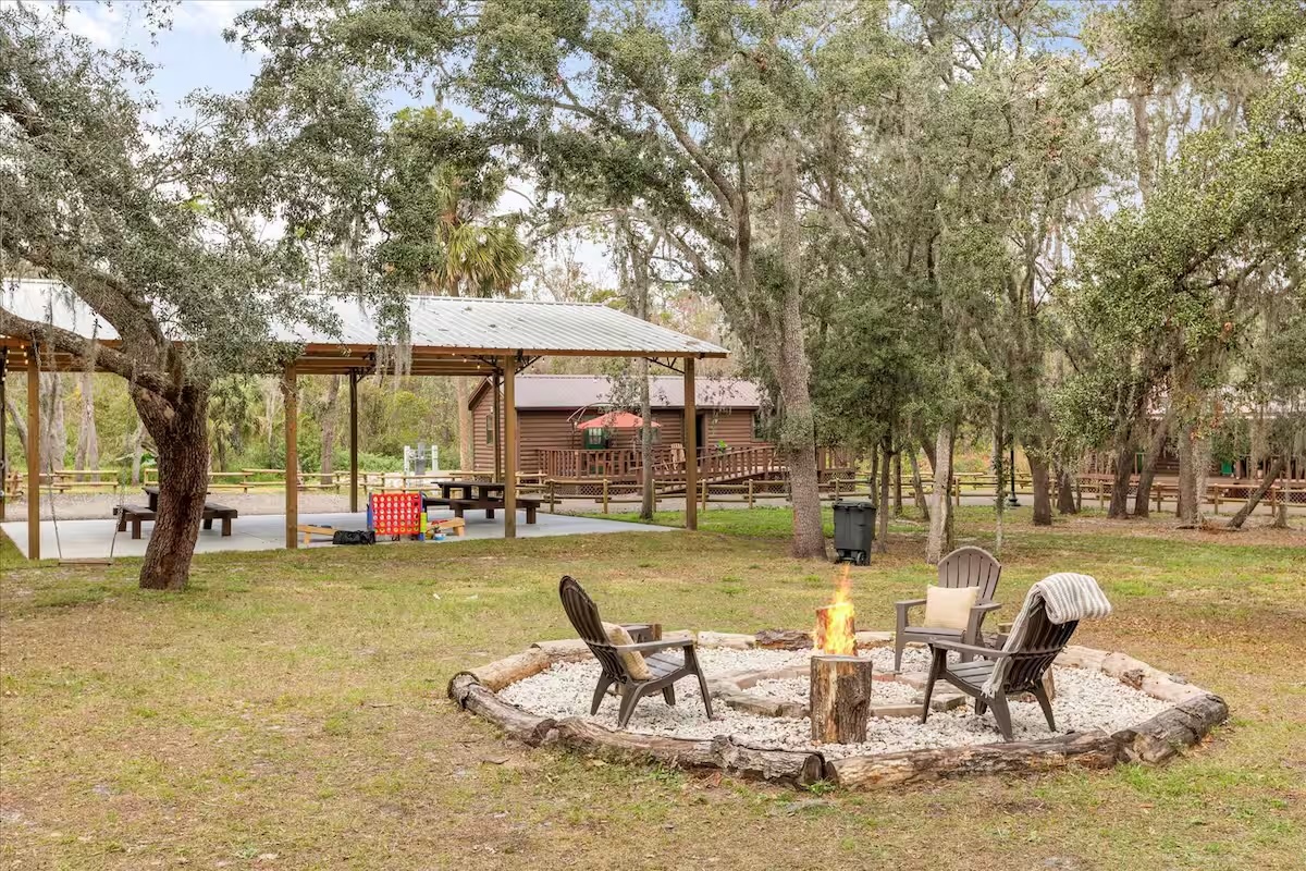 In addition to the three cabins, there’s also an outdoor pavilion with picnic tables and games, a laundry facility, a fire pit, charcoal grills, and more. It’s basically a mini Fort Wilderness!