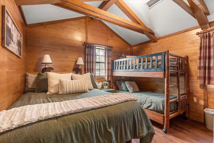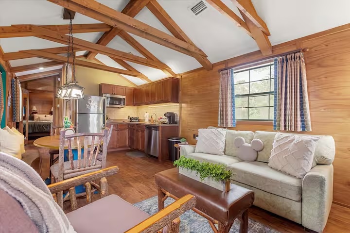 Each cabin holds up to six guests with four beds and one bathroom, along with a spacious living area, and full kitchen and dining area. There are three vintage Disney cabins available on the property, so you could potentially rent more than one if you’ve got a large group!