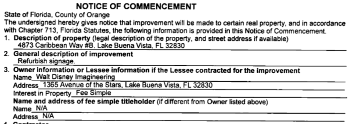 Disney filed a permit with Orange County, Florida for 4873 Caribbean Way #B, which is what is an address next to Pirates of the Caribbean. Now, usually, when we get something new like this, the permit is to “install signage.” But this permit is to “refurbish signage,” suggesting that the sign that’s still hanging over The Pirates League will be re-used and re-made into a sign for the new tavern.