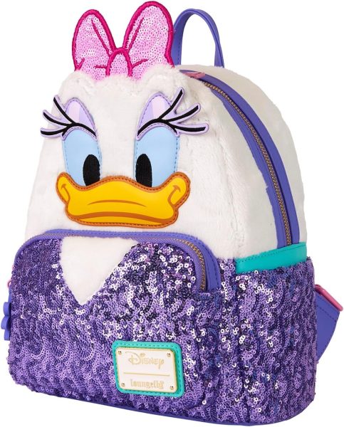You can pair the Loungefly with this Daisy tote. This 9.5” x 8” x 3.5” bag features nylon material, top handles, an adjustable detachable bag strap, zippered closure, a detachable vegan leather (polyurethane) bag charm, shiny gold hardware, embroidered and printed details, and coordinating 85th Anniversary lining.