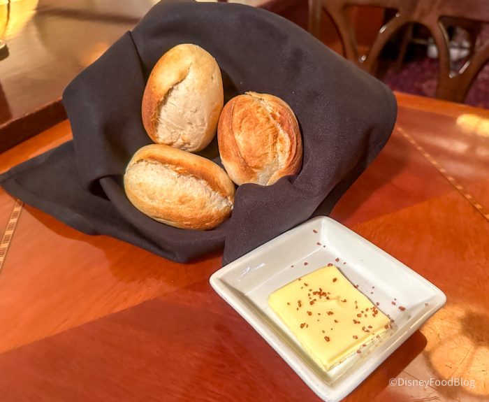Like any good Signature Restaurant at Disney should, your meal here starts off with Bread Service, which in this case means warm rolls and butter with sea salt.