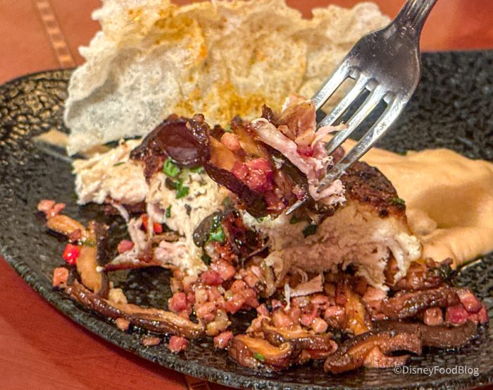 The lamb is nice and tender and pulls apart very, very well. It still has that nice flavor to it on its own, but there’s a deliciously spiced sauce that really makes it pop, especially when mixed with that mint yogurt. The quinoa pea salad is fine — you really have to like quinoa, but, man, the flavor is good. This is a really great option if you are already in the park and you don’t feel like going out to another resort or spending as much for that particular meal. The lamb literally melted off the bone when we got our fork in the vicinity of it. This was excellent!