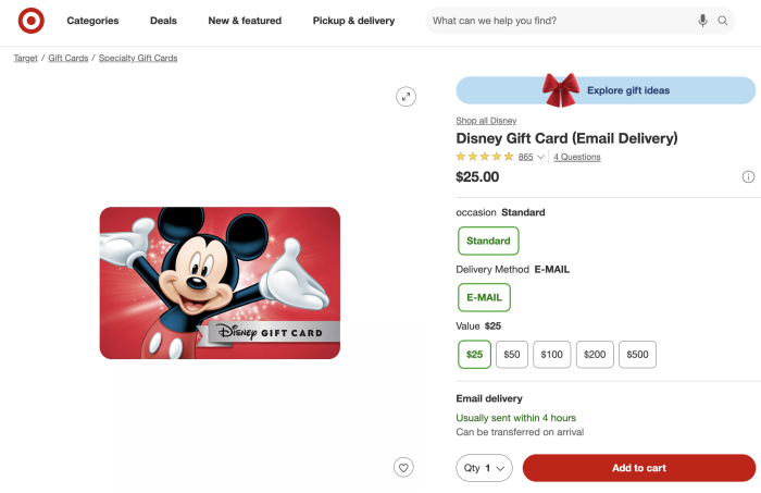 - While this discount excludes purchases of Target gift cards, it does NOT exclude purchases of Disney gift cards