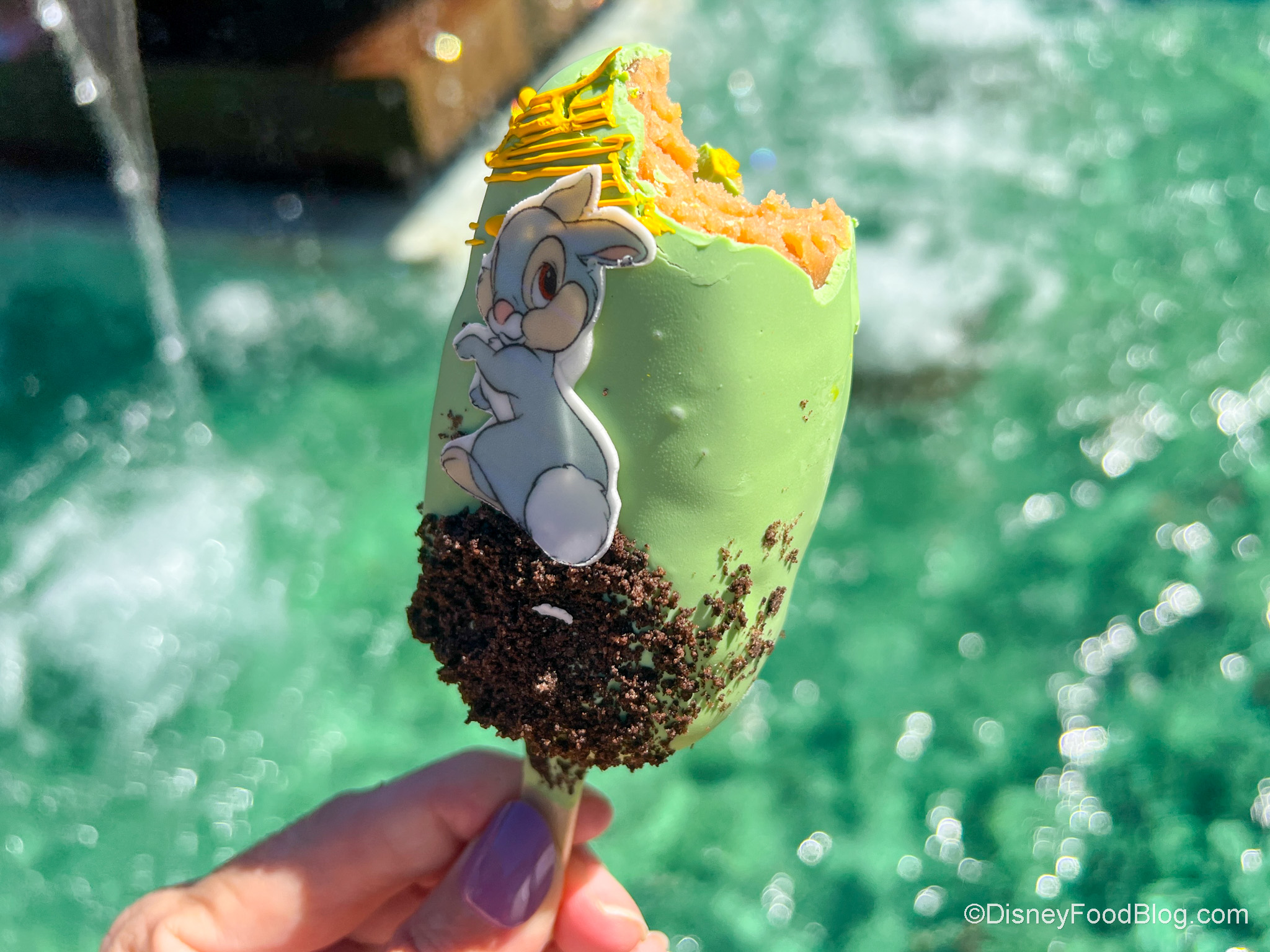 So there are a few options. You could just get the cake slice anyway and eat just what you want of it. Or you could grab a cake pop (which is easily found at Starbucks locations throughout Disney World). However, we may have a new favorite way to appreciate cake — the Cake Bar. Now we’ve already seen a few Cake Bar options at Amorette’s Patisserie in Disney Springs, and we’ve been fans. Well, a new Thumper Cake Bar now available as part of Disney World’s Easter treats menu is now available!