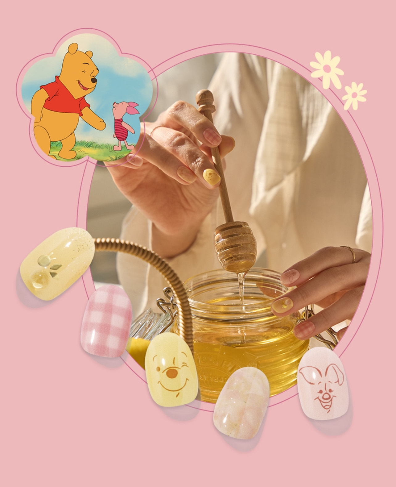 First up is Winnie the Pooh, where there are whole nails inspired by Pooh and Piglet. There’s a pink plaid nail, and the other ones remind us of honey.