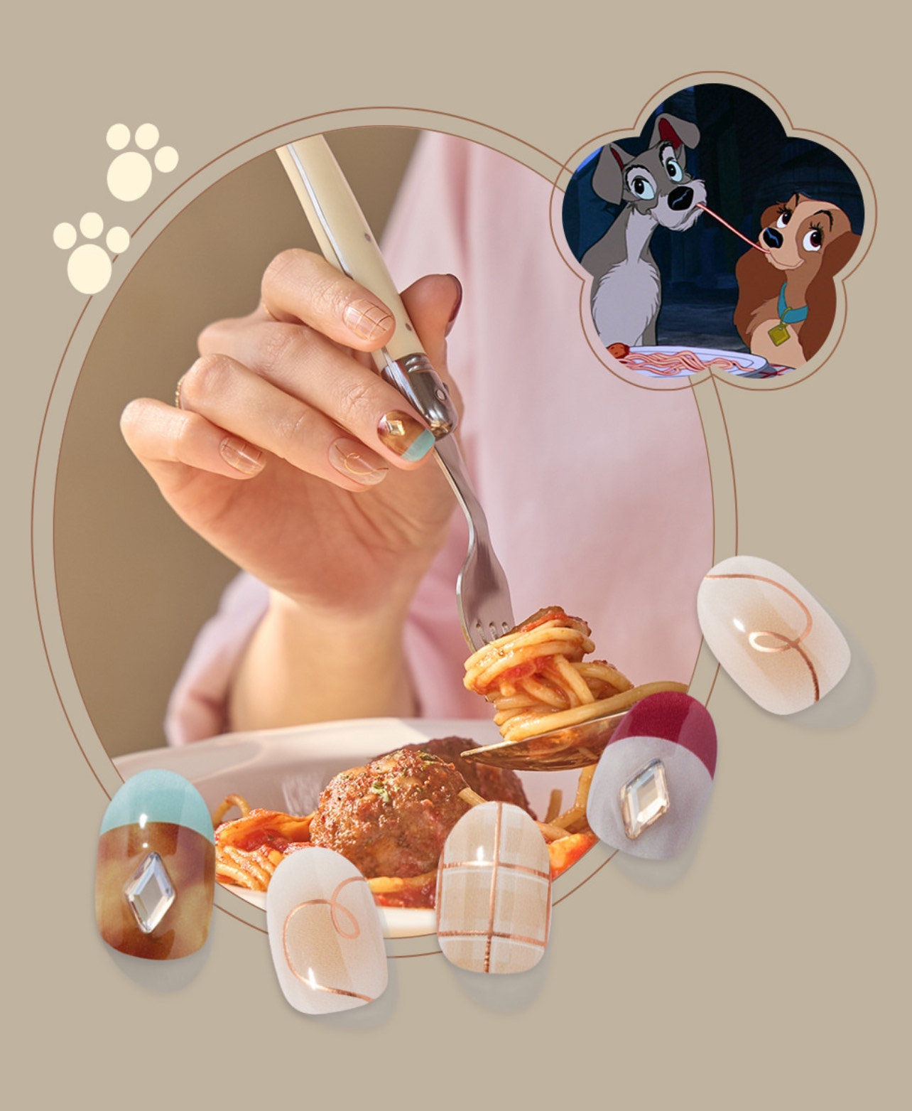 The last set is the most interesting. It’s Lady and the Tramp-inspired. Neither Lady nor the Tramp are on these nails, but instead, they are focused more on Tony’s, the Italian restaurant where they share that famous plate of spaghetti and meatballs. One nail even looks like it has a meatball design under Lady’s collar! OK… spaghetti and meatball nails? Now, THAT is interesting. You’re thinking outside the box, Disney, and we like it.