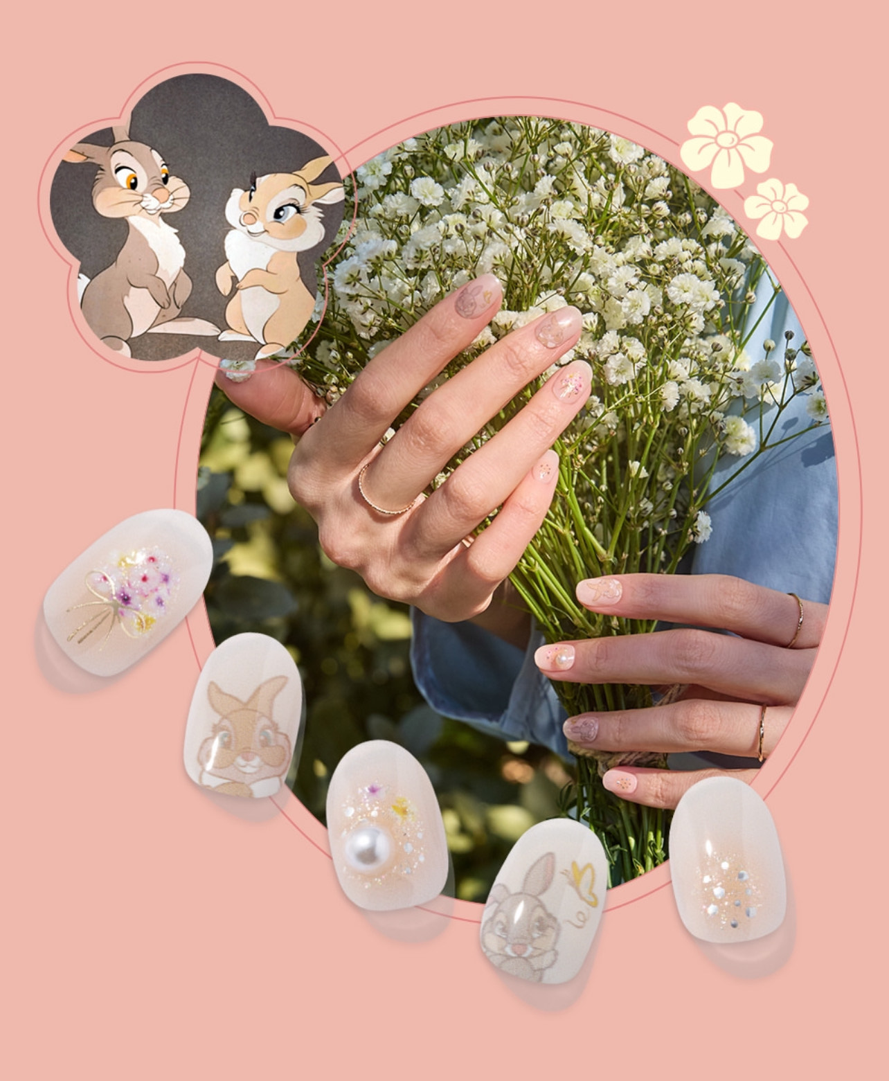 The next set is Bambi-themed but without Bambi himself! They have a Thumper and Miss Bunny nails and a big spring bouquet. We love how all of these nails are perfect for spring.