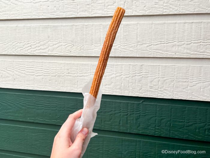 Next up, we have to talk about the sorry state of churros in Disney World. However, we still got the Churro for $6.99 here, and yep, we were disappointed. If you’ve been to Disneyland, you might expect those super fresh churros that practically melt in your mouth. This is not that. It’s a stale churro that tastes like it’s been sitting outside forever with hardly any doughiness. They’re tough and the only good thing about them is the cinnamon sugar coating. Even the chocolate sauce we got with it was VERY thin and runny. This is why we never order churros from quick service spots in Disney World. Ever.