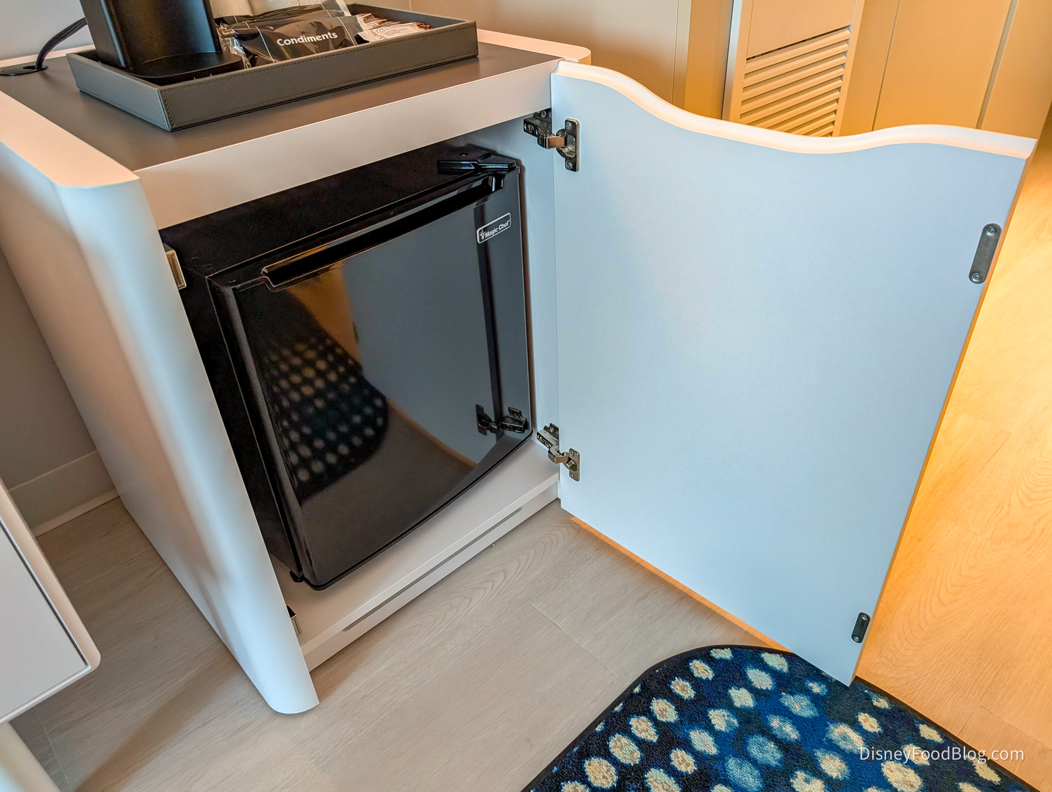 The rest of the room is laid out with several amenities including a fridge and a coffee maker…