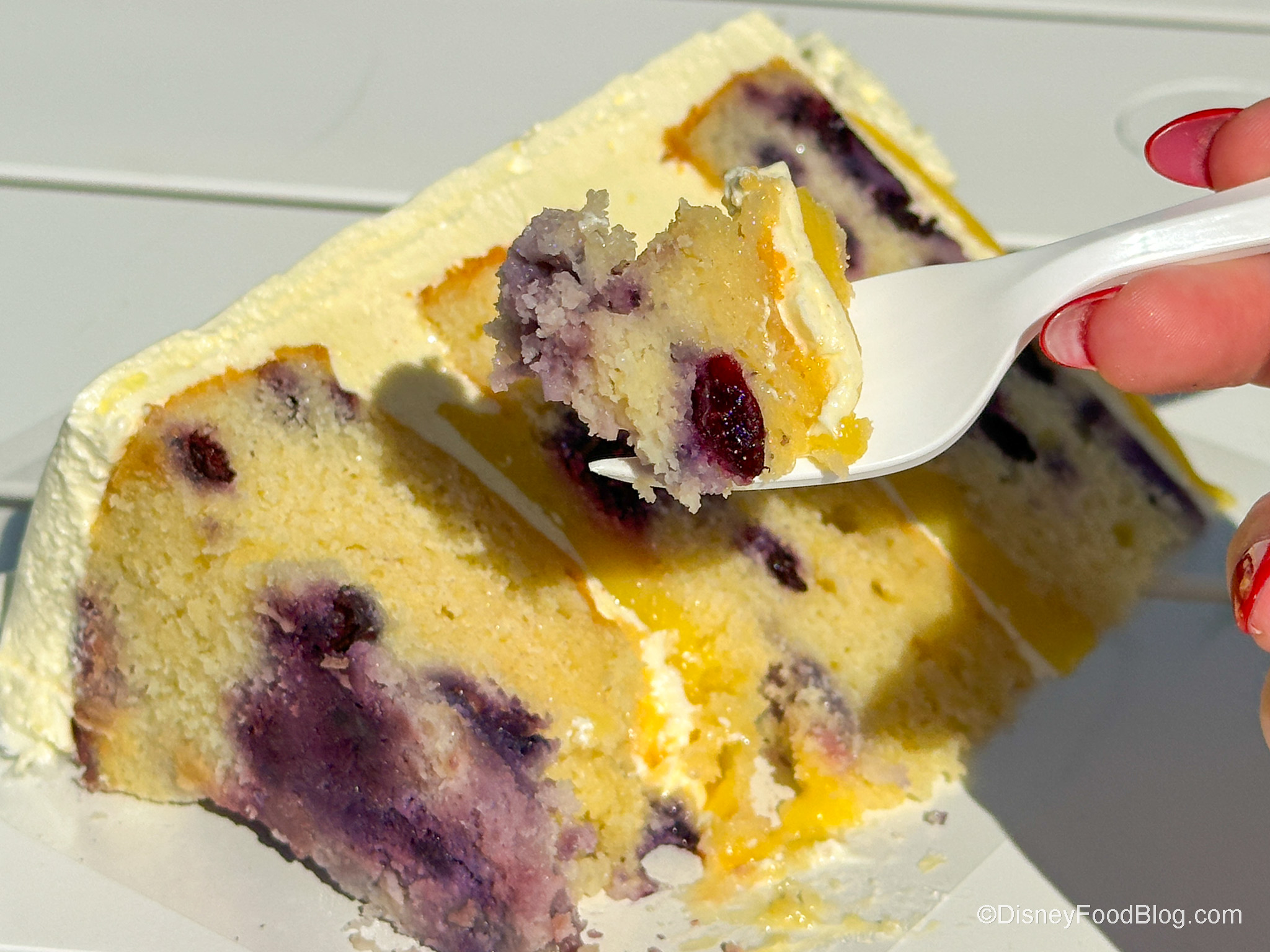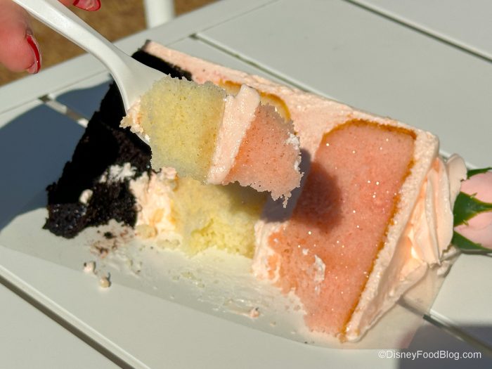 It’s got a super lemony flavor, but it’s a softer, sweeter lemon, and not too tart. The frosting is so light, too, and we loved it. The blueberries are super fresh and add a nice balance to the lemon. We will note that the lemon layers in this cake are a bit thicker than what you’d find in The Cake Bake Shop’s other fruity cakes, so you get a nice lemony zing with each bite.