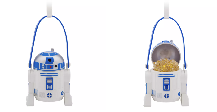 We thought they couldn’t get any cuter, and we were wrong! This next ornament features the R2-D2 popcorn bucket that opens at the top and, of course, lights up! It also includes the Star Tours carry strap.