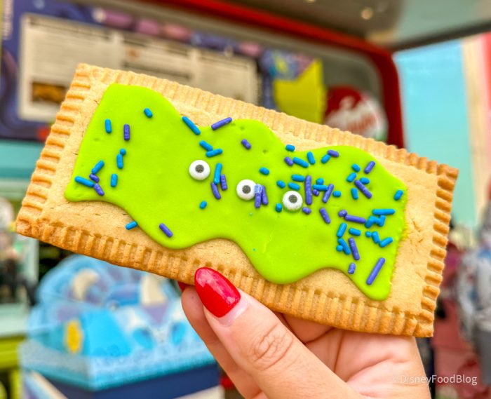 We headed over to Woody’s Lunch Box at Disney’s Hollywood Studios to grab the brand new The Clawwww! Lunch Box Tart for $4.99. This is a key lime curd-filled pastry topped with marshmallow fondant, sugar candy, blue sprinkles, and purple crispy pearls. This sounds like it could be a winner… but was it?