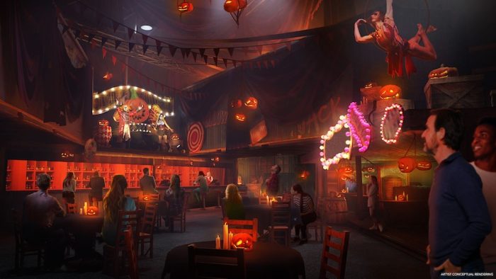 The in-depth horror theming will extend to the complex’s food and drink offerings, with several themed bars and food locations. One of which will be Jack’s Alley Bar. The bar will be themed to Horror Nights icon Jack the Clown, and feature specialty-themed cocktails and acrobatic performances in a “circus-like hellscape” environment.