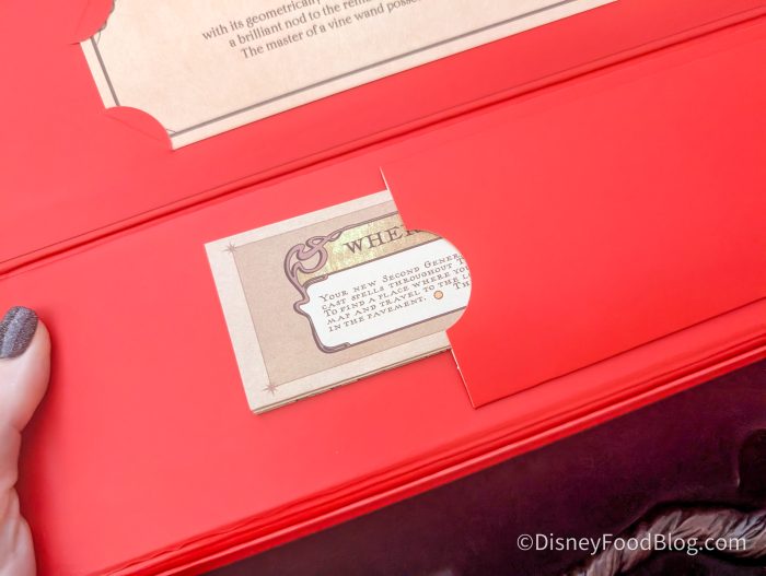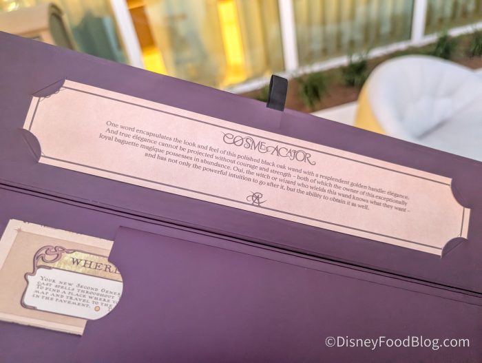 The wands will feature signature three-sided boxes that come with a map of the land so you can practice spell casting! Each wand comes with an insert with information about the wand, and the wand that we grabbed says…