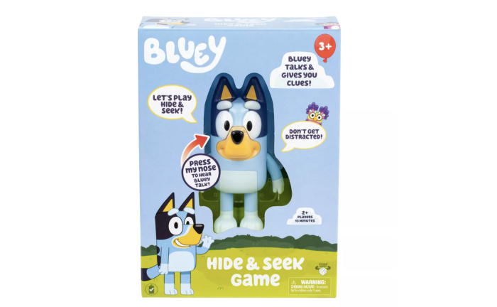 Bluey helps bring this hide-and-seek game to life with this talking figure! Place the Bluey figure anywhere and press her nose to start the game. The first person to find the figure wins, but will you do it before the timer runs out? It also features a dance mode to enhance the fun!