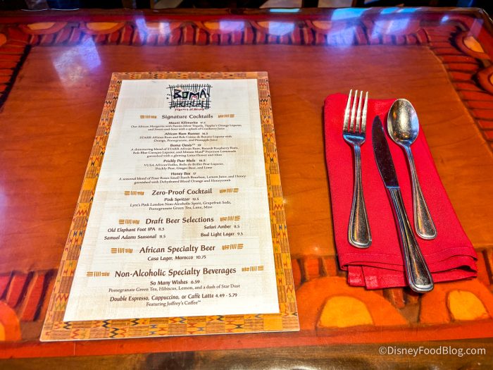 Again, this is buffet style, and there are TONS of options available for both breakfast and dinner. In addition to the food options, you can also choose to get one of their Signature Cocktails, Zero-Proof Cocktails, Draft Beers, African Specialty Beers, or Non-Alcoholic Specialty Drinks for an additional charge.