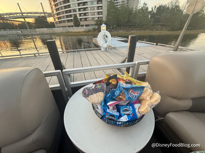 When you check in, a Cast Member who will be your captain will guide you along the dock to board your pontoon boat. This Cast Member will be along for the entire ride, and it can be super fun to chat with them and learn about the history of Disney World! The price of your cruise includes bottled water, sodas, and snacks. Alcohol is allowed on board, just not in glasses or glass bottles. Before boarding your cruise, you can head to the Sand Bar right outside the marina to pick up a drink.