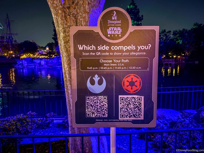 Ahead of the show, make sure to find the signs around the park that let you actually CHOOSE your path. Scan the QR code for whichever side of the Force you want to represent.