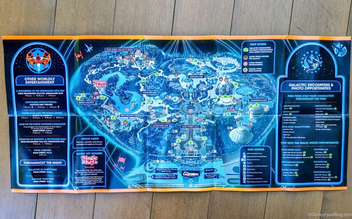 There are LOTS of entertainment options available during Star Wars Nite. Make sure to bring your lightsaber along with you so you can show up at the Millennium Falcon for A Gathering of the Resistance with Rey. Disney describes it as a “powerful show of unity.”