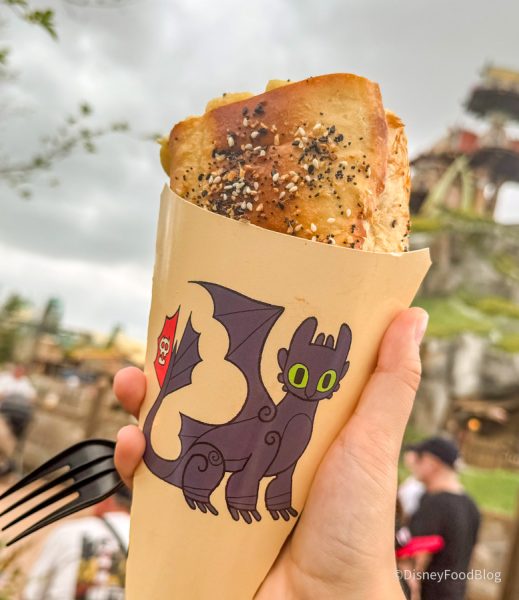 Texture game: on point. But the cone itself? Absolute star. Think of the best parts of an Olive Garden breadstick—soft, buttery, slightly garlicky—and then add the perfect crunch on the outside. We could eat the bread cone on its own and be happy. They had other mac and cheese cone flavors, and you can bet we’ll be back to try the rest. This one definitely earned a spot on our “must-eat” list at Epic Universe!