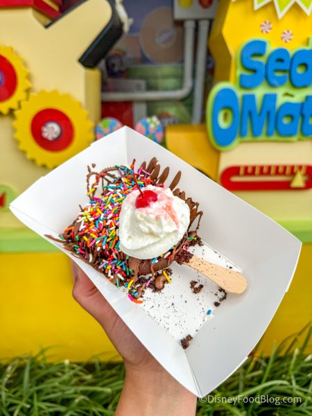 We chose to buy the two-topping Mickey ice cream bar option with whipped cream, sprinkles, chocolate drizzle, and a cherry on top!