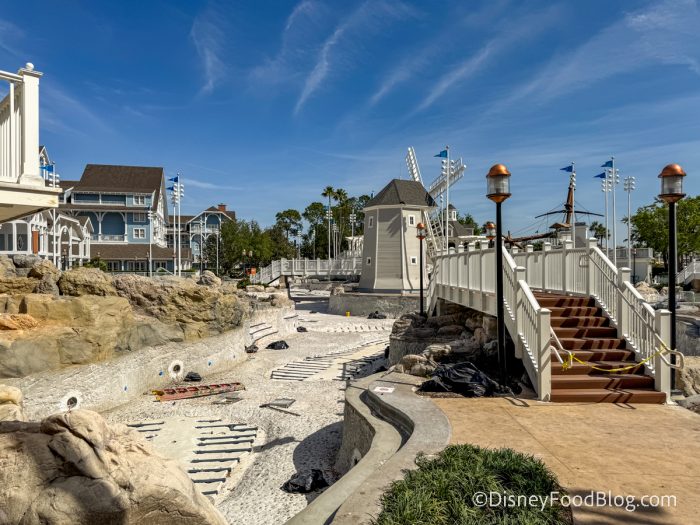 Stormalong Bay is the shared pool between Disney’s Yacht and Beach Club Resorts. It features a beach, a lazy river, a large pool, and an exciting pirate ship slide! When we stopped by recently, we noticed that they were hard at work at Stormalong Bay.