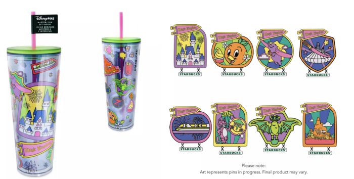 Some of these Disney Starbucks items do make their way online, like this tumbler, which features ”sticker” style graphics inspired by attractions at Walt Disney World’s Magic Kingdom. It also two includes corresponding mystery pins in the same style!