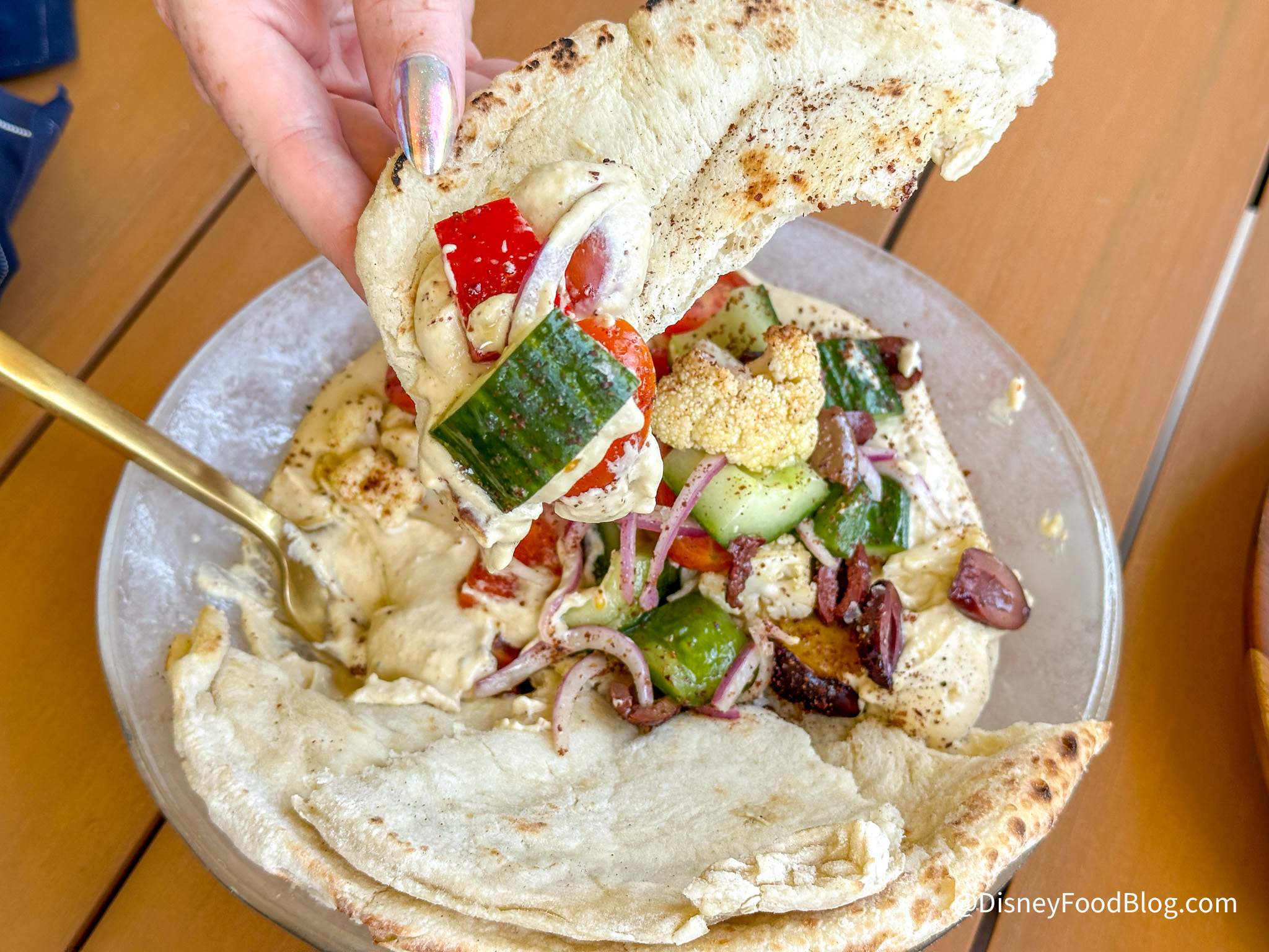 The Hummus Bowl costs $22 and includes fresh pita, charred cauliflower, onions, jubilee tomato, Greek olive, Persian cucumber, and lemon oregano vinaigrette.