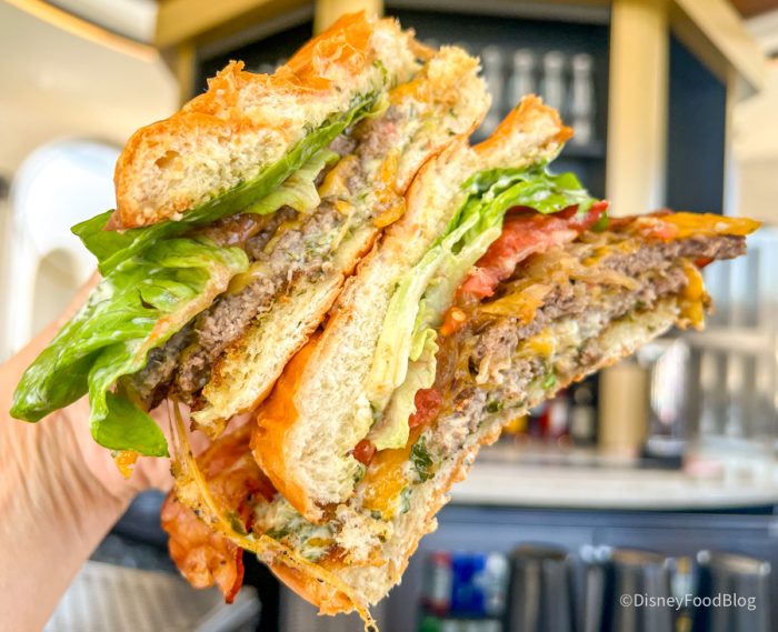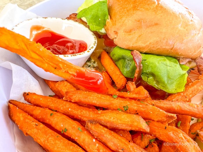 It was a brioche bun, and we always enjoy that on a restaurant burger, since it’s slightly sweet and soft. The burger came with your choice of sweet potato fries or regular fries. We opted for sweet potato because we hadn’t seen those on another menu. They were good. They were standard. We wouldn’t say there was anything special about them, but they were good. We would say this at $25 is decent for what you’re getting. You’re obviously getting quality meat, and that’s no different than you would have at another resort, and we love that it’s a decent-sized burger, which would make it shareable for a light lunch.