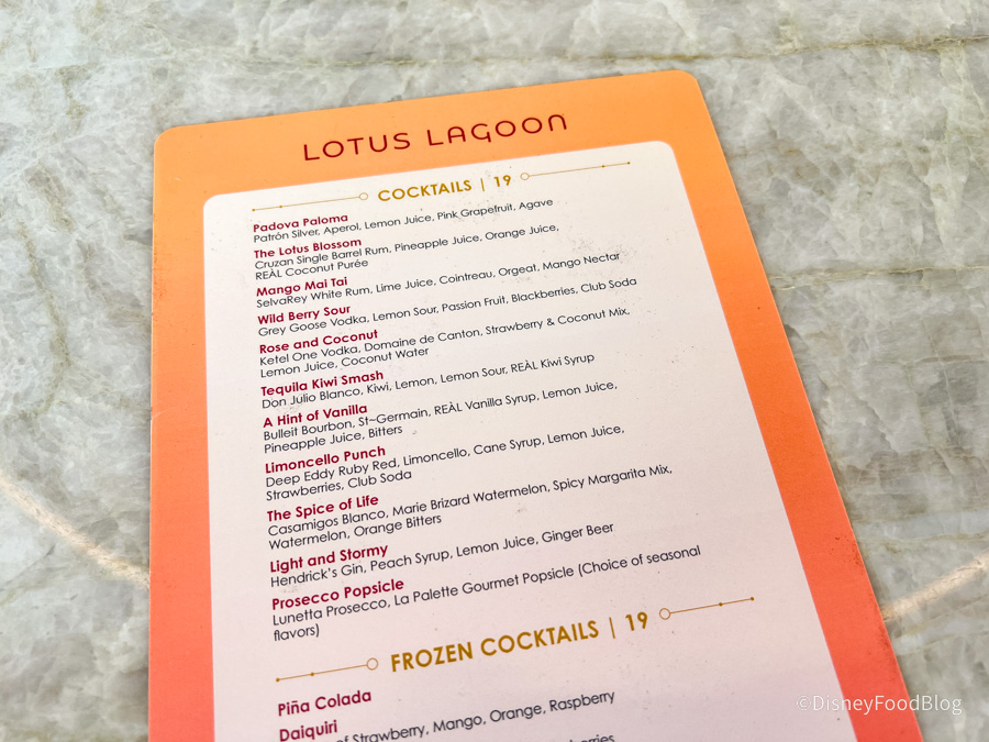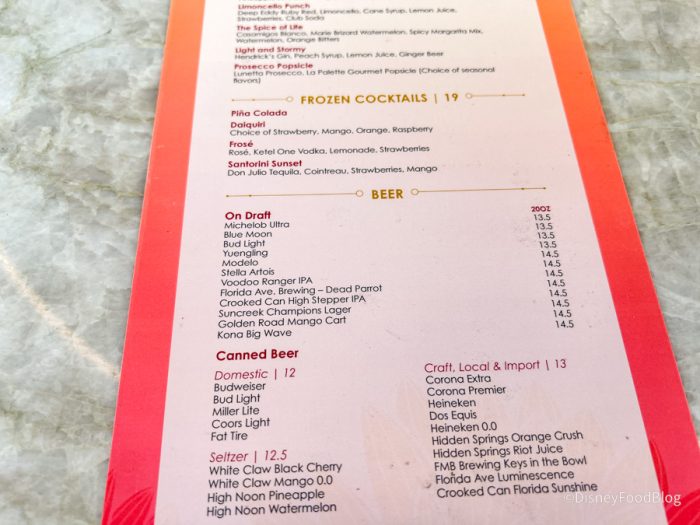 This was so fun! It’s a glass of prosecco with a popsicle upended in it. You stir it, let the popsicle kind of melt and drip into your prosecco, flavoring the prosecco. It kind of has that mimosa vibe, where you’ve got a fruit juice and the prosecco by the time that you’re done. The popsicles here are a standout — we were told they’re made locally by a small business here in the Orlando area. The drink is served in a white wine glass because you have to have room for the popsicle and you can’t do that with a champagne flute. That can mean that your bubbles might expire a little sooner than they would in a champagne flute, but we didn’t have any qualms about that or problems with that.
