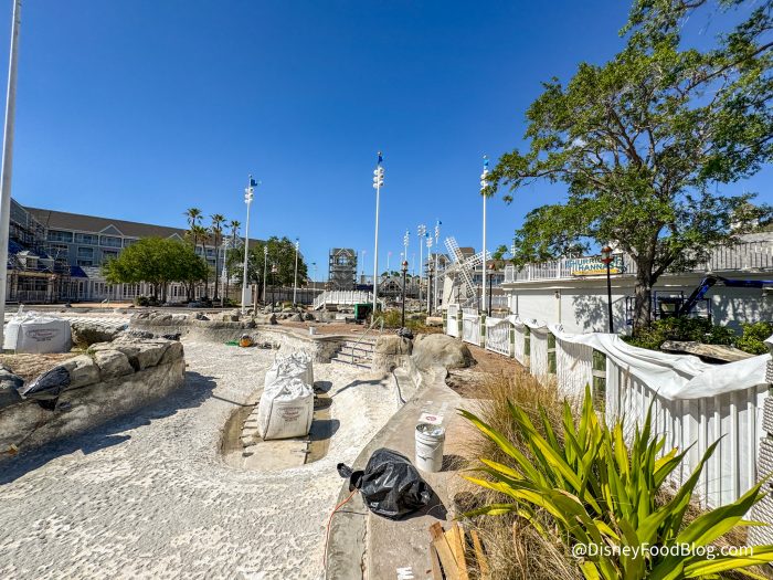 Stormalong Bay is the shared pool between Disney’s Yacht and Beach Club Resorts. It features a beach, a lazy river, a large pool, and an exciting pirate ship slide! When we stopped by recently, we noticed that they were hard at work at Stormalong Bay.