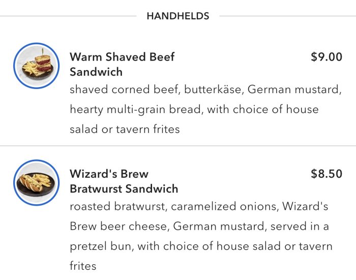 First up, we grabbed the Warm-Shaved Beef Sandwich for $17.99. This dish is made of shaved corned beef, butterkäse, and German mustard, served between two hearty multi-grain bread slices with a choice of house salad or tavern frites.