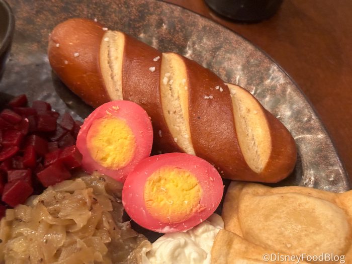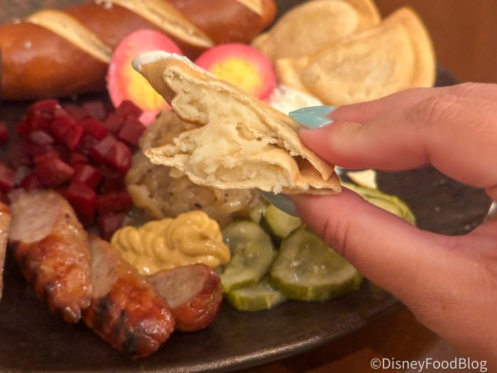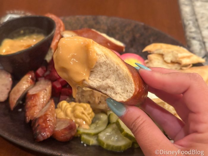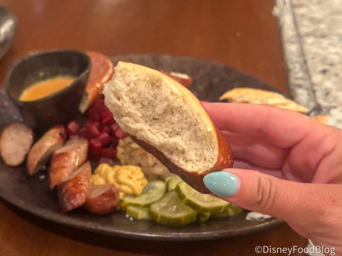 The first place our eyes were pulled to on the platter was the pretzel bread. It was served warm to the touch and broke open with ease…
