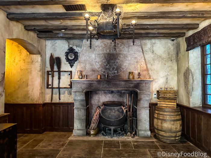 As you walk through the entrance of the restaurant, you’ll enter a large sitting room filled with minimal decor, like brooms and a spacious fireplace with strange writing above it. A keen eye may have noticed that just above Le Gobelet Noir sits the home of Nicolas Flamel. He’s a famous alchemist known for creating the Philosopher’s (Sorcerer’s) Stone Harry seeks out in the first book and film.
