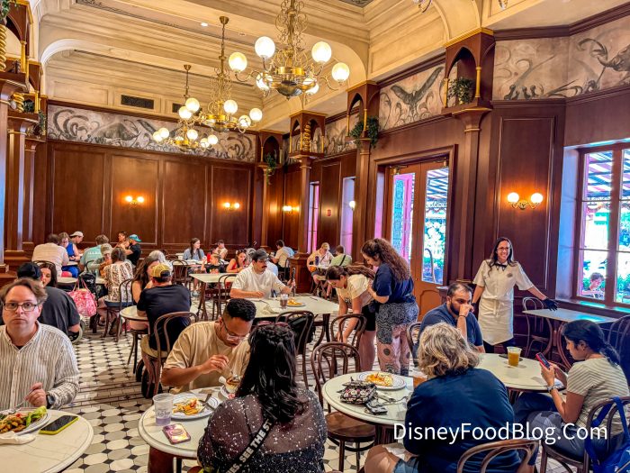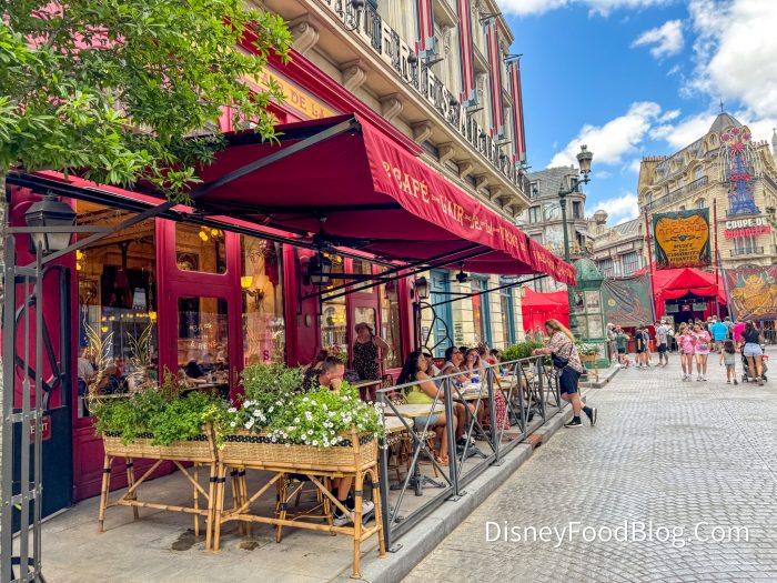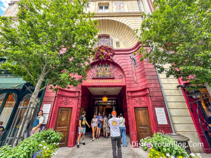 When we first stepped into 1920s Paris (the theme of the land), we went straight to Cafe L’air de la Sirene! This quick service, which is named the Sirean’s Breath Cafe in English, has one large red entrance; however, thanks to the garden gates on the corner of the building, it was a bit confusing before we went inside.