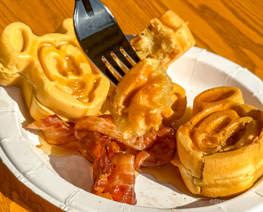 We stopped by Fairfax Fare at Disney’s Hollywood Studios for some breakfast, where you can get a Mickey Waffle Platter (and a mimosa!) as long as you order before they switch to lunch service. We picked up the Mickey Waffle Platter this time around, which is $9.49 and comes with syrup and a side of bacon.