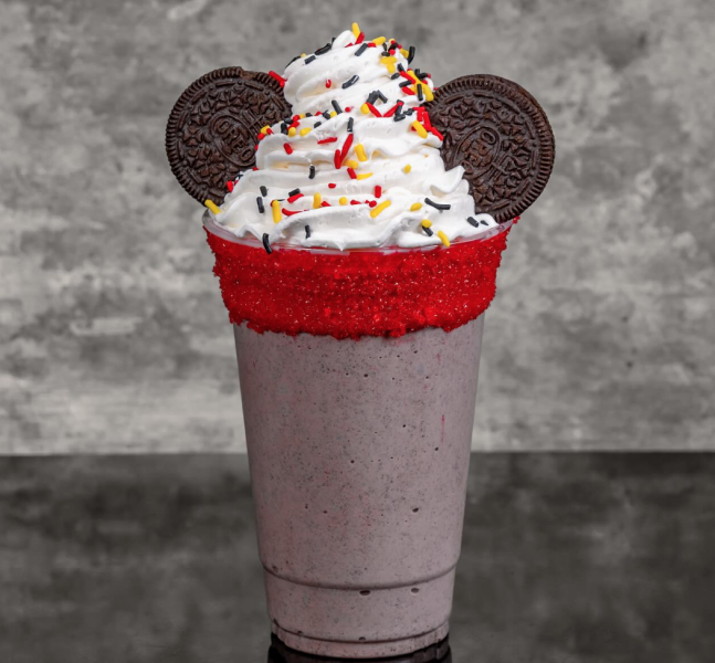 …the Mickey Mint Cookie Shake made of mint cookies and cream shake with whipped topping, sprinkles, crème-filled chocolate cookies, and red sugar rim will be calling your name at Schmoozies…