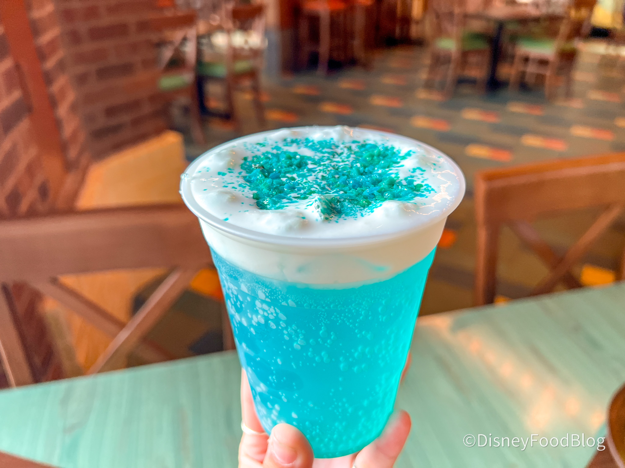 Can we start by talking about how beautiful this is? It’s shimmering blue, and the foam makes it look like a real cocktail, so everyone can feel included. We might not call this an official mocktail, but rather a fancy soda, which we enjoy just as much. The blue raspberry flavor is upfront, with Sprite being the strongest. When we took a sip, we realized there were Pop Rocks on top, too!