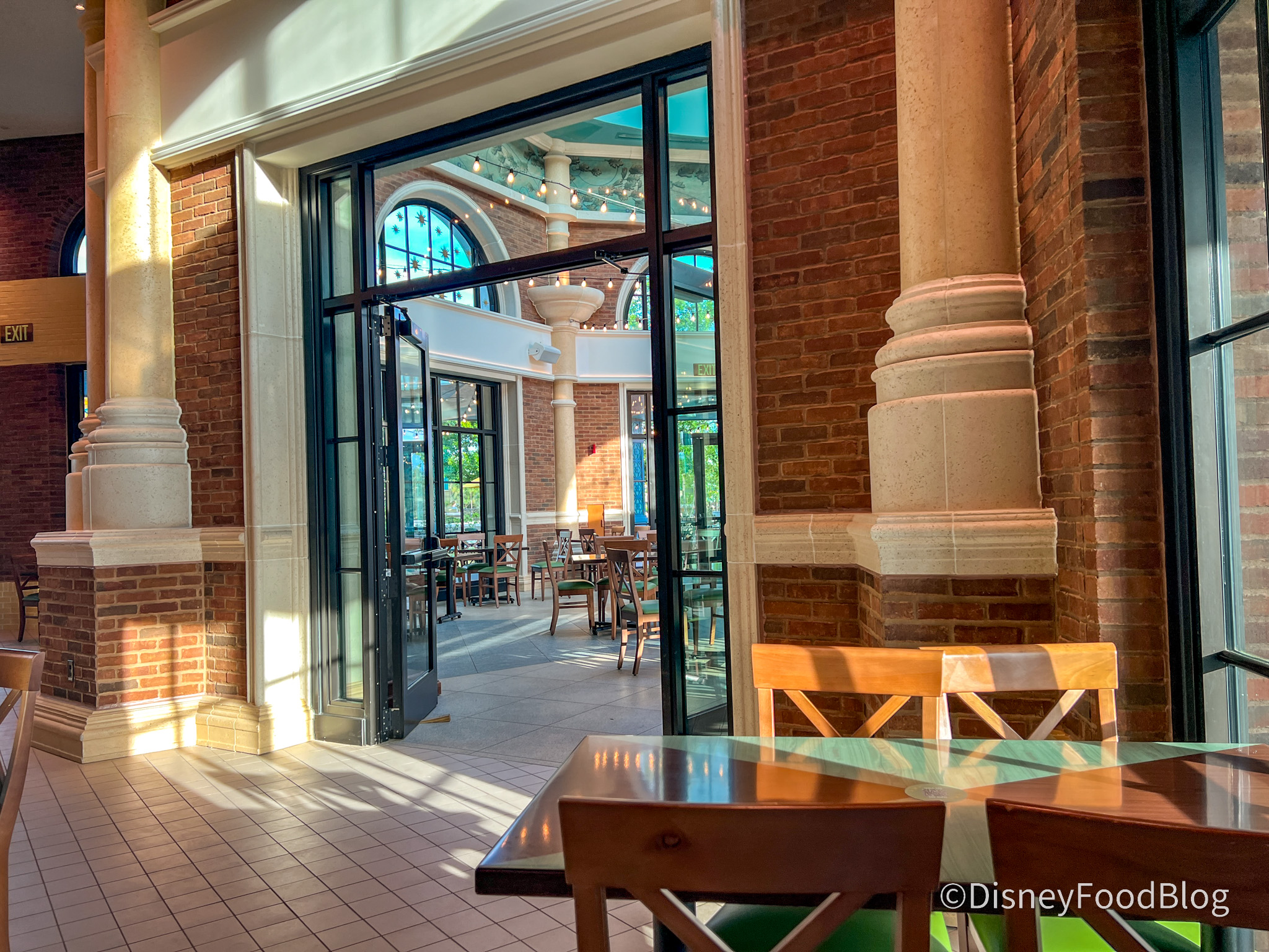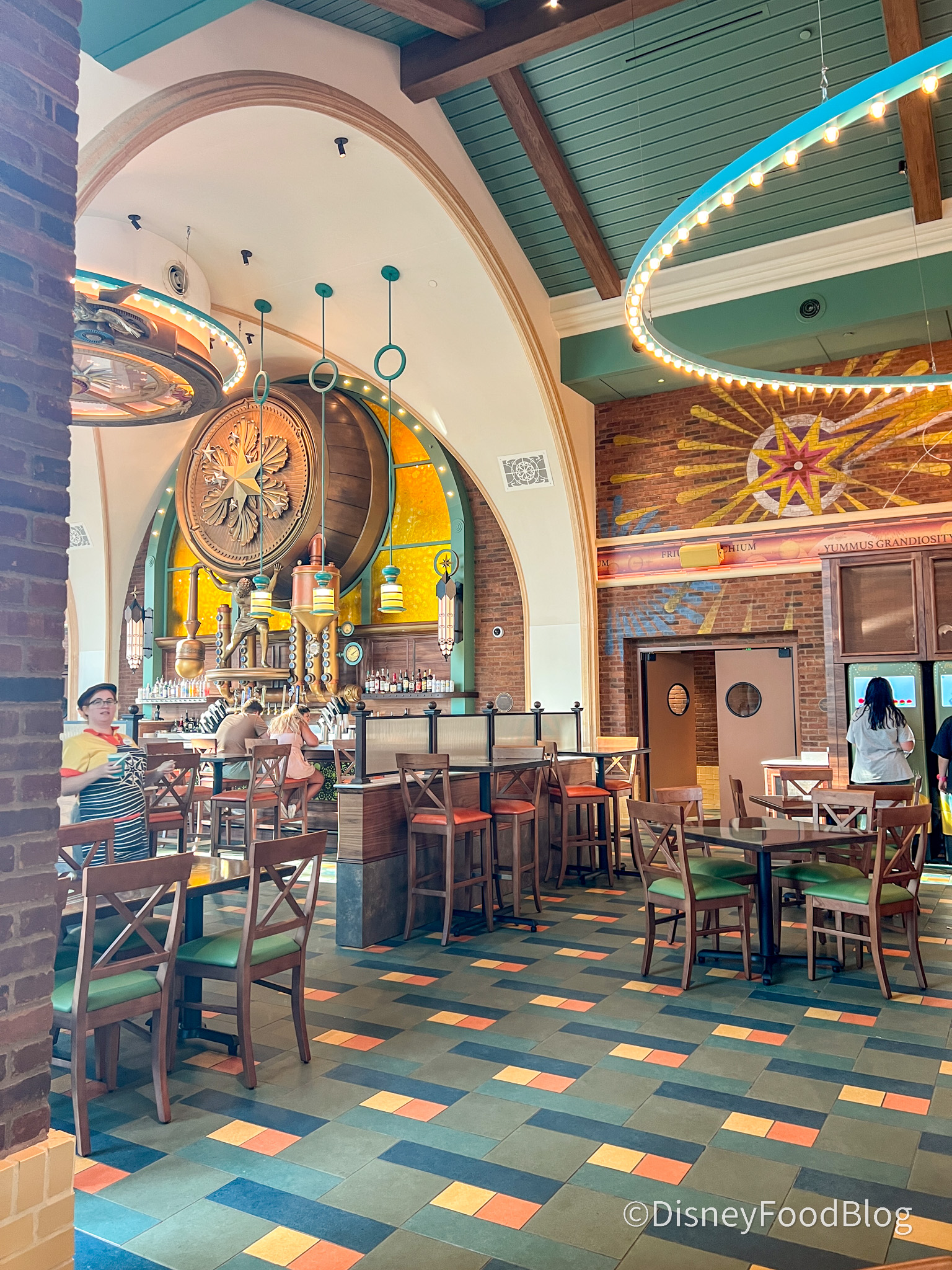 This vibrant gastropub is a meteor-themed hangout covered in stars and planets. When you walk in, it feels like a grown-up version of a space-loving little kid, which gives us a strong sense of nostalgia while we’re in the theme park, making us feel like little kids again. Tables and booths fill the room, offering options to sit at a high-top table for those seeking a more gastropub vibe.