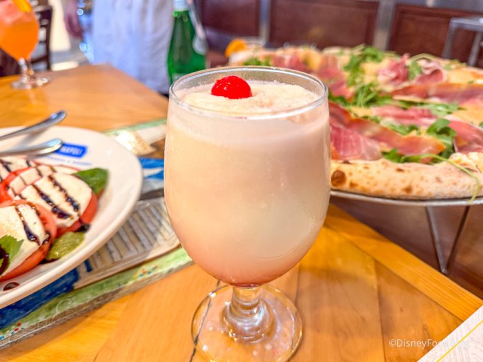 We sampled two different drinks available at Via Napoli. The Frozen Vulcano was a non-alcoholic drink, and it’s essentially like a frozen Piña Colada with a little raspberry syrup in it. If you’ve ever had a Piña CoLAVA at Disney World, it was kind of like that without the booze! It was sweet, but not too sweet, and very fruity. Kids would probably love this because when you stir it and mix it together, it kind of bubbles up like a volcano, which we thought was really neat.