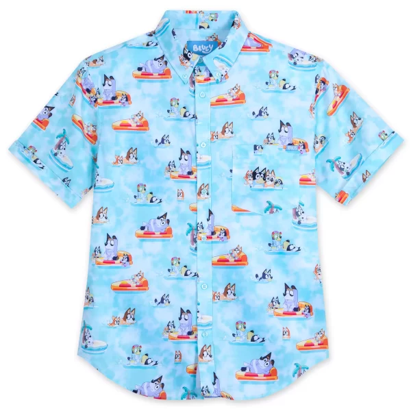 Another short-sleeve button-up shirt, but in a ladies’ cut, with the Heeler family on their beach day. The shirt is the iconic Bluey blue and has a fun design with seagulls, crabs, ice cream cones, seashells, and more.