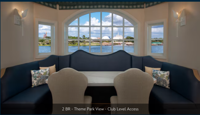 Over at Disney’s Grand Floridian Resort, there are several fancy rooms, but the two-bedroom room with club-level access is one of my favorites. It sleeps 6 adults, and the decor in this room is stunning. You also get the great perks of club level, including food and drinks.