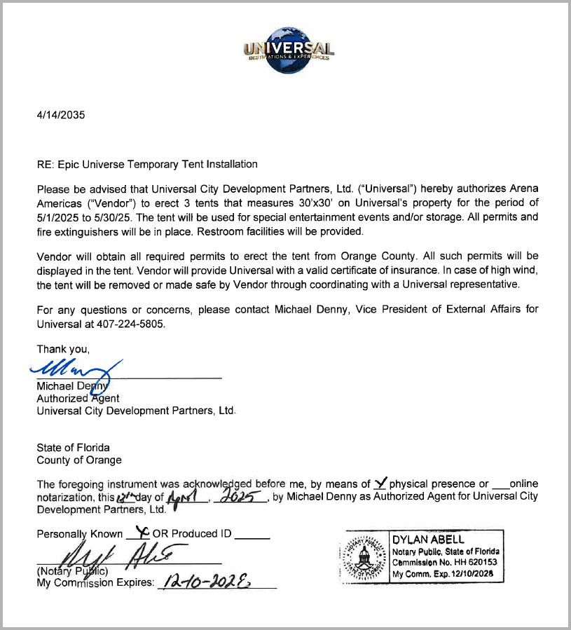 The permit is for backstage preparation and staging operations in an area behind the Wizarding World of Harry Potter — Ministry of Magic at Epic Universe, and shows the locations of tents, trailers, and other things set up for the event.