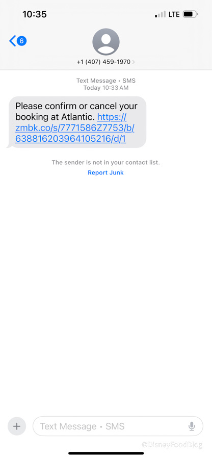 We were at Epic Universe the other day, waiting for our reservation at the Atlantic restaurant, when we got a text that sort of appeared sketchy at first — since we had never received a text like this from Universal before (they do have an incredible hotel texting system, but it doesn’t apply to the parks!). While we did have a reservation for this restaurant, we weren’t sure if we should click the link in the text message.
