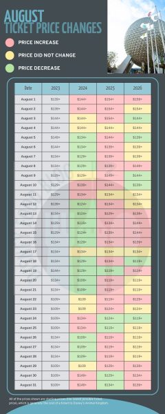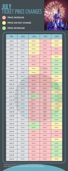 Overall, the price range of tickets will go up in 2026. In 2024, the starting prices ranged from $109 to $164. In 2025, the starting prices were between $119 and $169. In 2026, the starting prices for tickets will be between $119 and $169. Here’s a look at ALL the price changes, month-by-month: