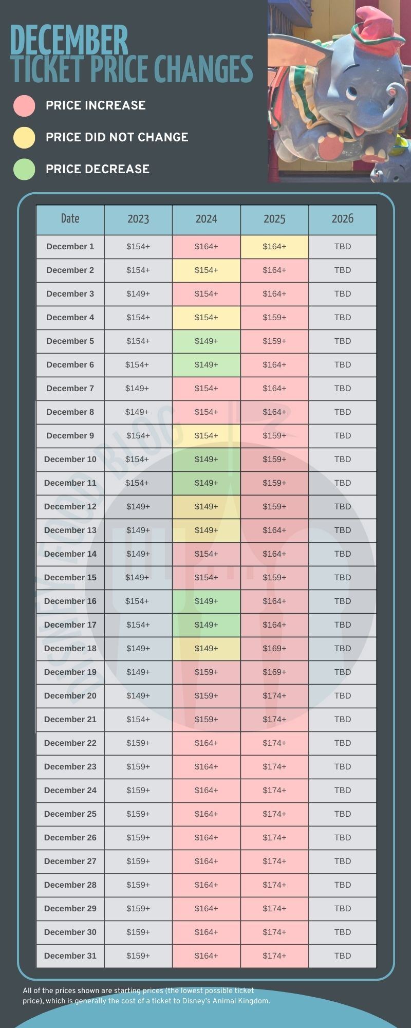 Note that the prices we’re working with here are the starting ticket prices, which means the lowest possible rate. Usually, this is the price for Disney’s Animal Kingdom, so you can expect prices for the other parks to be a bit higher. However, this data can be a good starting point to help you decide which days to visit Disney World.