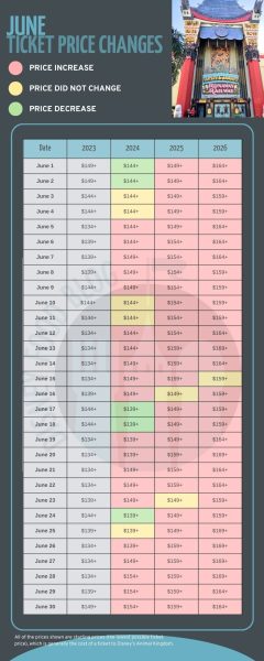 The ticket price increases just keep coming! Only three days in April 2026 don’t see a price increase, however there is one day with a price decrease, April 27th.